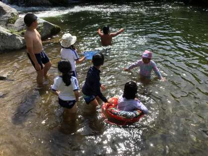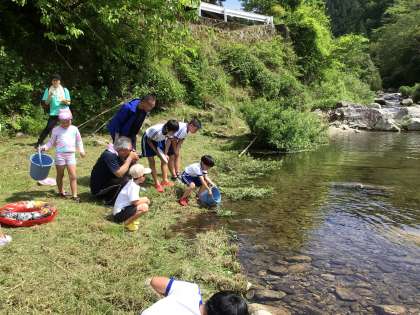 5月18日(土) 稚鮎放流 公開日 2024/05/18 更新日 2024/05/18 校長室から 14時、全校児童20名は連谷地区(段戸川)に集合しました。 毎年恒例の稚鮎の放流です。 名倉川漁協の安藤様に協力してしていただいています。 愛知県水産課の方からの説明の後に放流です。 バケツに入れた稚鮎を保護者のみなさんにリレーしていただき、子どもたちが段戸川に放流して行きます。 放流の後は、お楽しみの水遊びです。 子どもたちの笑顔が、段戸川の川辺に広がりました。