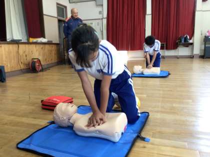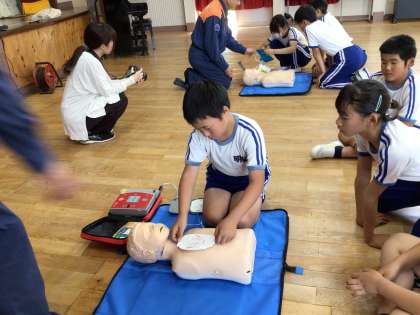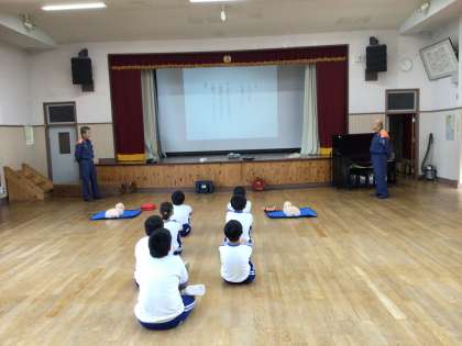 5月30日(木) 応急手当講習会(高学年) 公開日 2024/05/30 更新日 2024/05/30 各学年から 3時間目、消防署の方を講師に迎え、応急手当講習会を行いました。 今年度も5・6年生が講習を受けました。 まず、AEDによって救える命について、ビデオを見ながら考えました。 その後、胸骨圧迫やAEDの使い方について体験をしながら勉強しました。