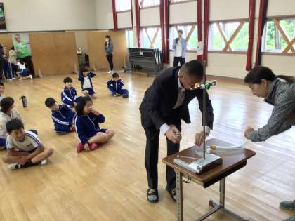 今日の朝会では、「先生からの話」で神谷先生が理科の実験をしてくれました。