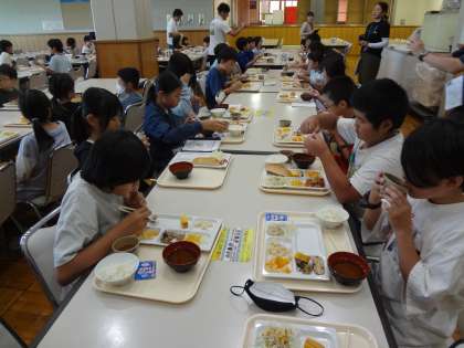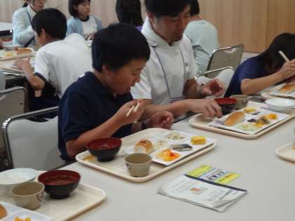 5年生キャンプ 7朝のつどい・朝食・清掃 公開日 2024/06/18 更新日 2024/06/18 各学年から 2日目になり、朝のつどいがありました。しおりや時計を確認して、全員が時間を守って、集まることができました。そのあと、自分たちが宿泊した部屋の清掃をしました。そして朝食を班で一緒に食べました。