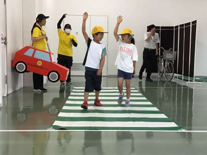 低学年は、まず初めに、室内で歩行練習を行いました。歩行者用信号機が青に変わったのを確認し、「右・左・右、車よし」と大きな声を出し、周りに気をつけて横断歩道を渡る練習をしました。