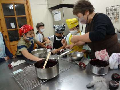 10月4日 校外学習(ブルーベリーのこみち・中学年) 公開日 2024/10/04 更新日 2024/10/04 各学年から 中学年は、総合的な学習の時間に「ブルーベリーのこみち」(校外学習)に行き、学校で収穫したブルーベリーを使ってブルーベリージャムを作りました。施設の方に教えていただきながら、自分たちでおいしいジャムを作ることができました。来週はこのジャムを使い、料理をする予定です。