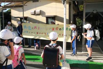 10月21日(月)に5・6年生が全校に向けて学芸会のスローガンを発表しました。『思い出に残るみんなが主役の学芸会 〜仲間と共に届けよう 友情、成長、感動〜』学芸会の劇や合唱、合奏だけでなく、係の役割も含めて、20人が協力し合うことを目標にスローガンを掲げました。