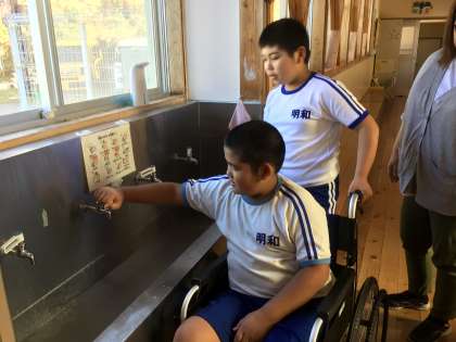 低学年は集会室で、中高学年は渡りから教室棟に入り水道で手を洗って、集会室に戻るコースで体験しました。