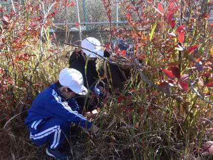5・6時間目、中学年の総合的な学習の時間に原田道春さんをお招きし、ブルーベリーの木の剪定をしました。原田さんに教えていただきながら一緒に剪定をしたり、木の根元から生えている雑草を切ったりしました。「この作業をしておくと、来年大きいブルーベリーの実ができるんだね」と話をしながら、協力して作業することができました。