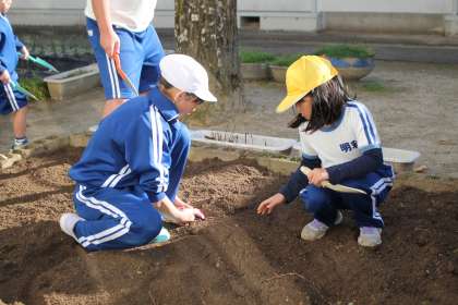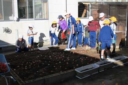 5時間目に1・2年生の花壇にチューリップを植えました。1・2年生が考えた花壇のデザインから、全校に投票してもらい、選ばれたデザインをもとにして5年生と一緒に植えました。来年度の新一年生が入学してくる頃に、きれいに咲いてくれることを願って植えました。