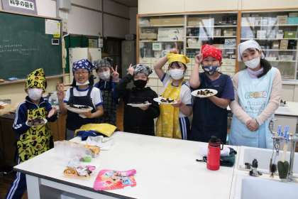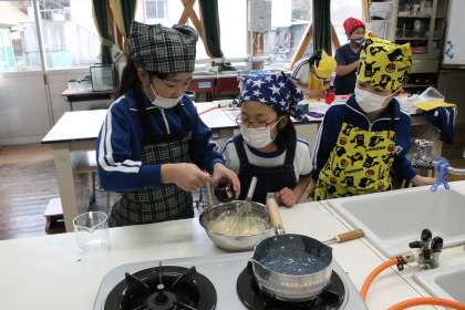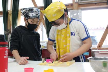 3・4年生は、総合的な学習の時間に「今までほかの学年の子からいろいろなものをもらってきたから、全校にお礼がしたい」と言って、パンケーキとクッキーを作りました。
