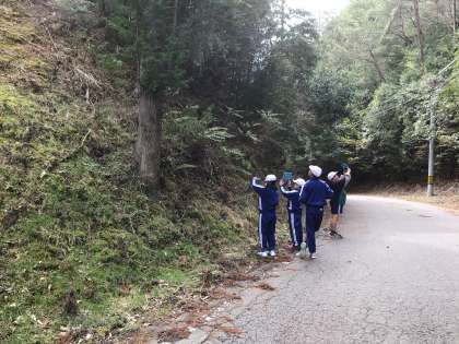 5、6年生では、総合的な学習の時間で明和小学校の周りの森林について学習することになりました。そこでまずは、明和小学校の周りにはどんな木があるのか調べました。思っていたよりも多くの種類の木に出会った子もいたようです。