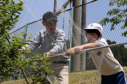 3・4年生が総合の授業でブルーベリーの木にネットをかけました。おいしく実るブルーベリーを鳥から守るためです。1年間、3・4年生でブルーベリーの木を大切に育てていきます。