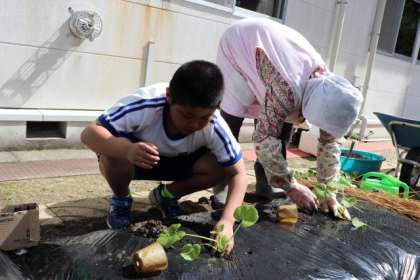 ひだまり学級の畑にこんにゃくいも、かぼちゃの苗を植えました。ポップコーンの種もポットで育てて、畑に植える予定です。教室から見える場所にある畑なので、いつでも様子をみることができます。収穫まで大切に育てます。