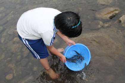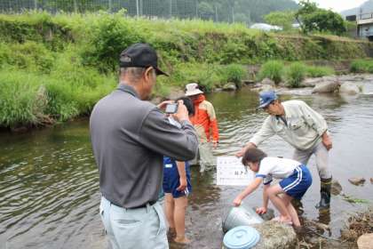 地域の行事として、段戸川に鮎を放流しました。たくさんの明和っ子が参加しました。