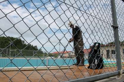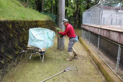 公務手さんと校内整備員さんがプールをきれいにしてくれています。プール開きに向けて、少しずつ準備がはじまっています。
