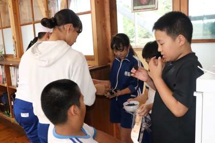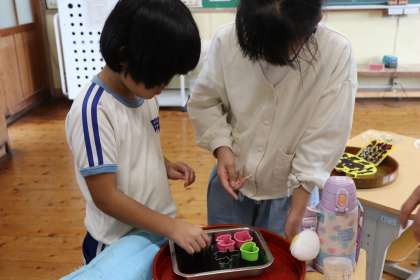 3・4年生が、学校にあるブルーベーリーをネットを張ったり成長を観察したりしながら大切に育ててきました。その甲斐もあり、この夏たくさんのブルーベリーを収穫することができました。収穫したブルーベリーでグミを作りました。作ったグミを他の学年に配ると、「おいしい!」「これを食べたから次の授業がんばれそう!」と言いながら食べる姿をみて、3・4年生もとてもうれしそうにしていました。