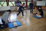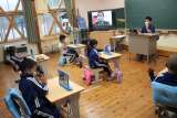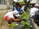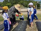 1・2年生でサツマイモのつるを植えました。植え方のこつをいづみさんに教えていた...