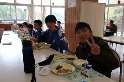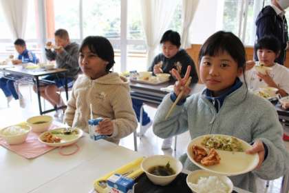 感染症対策のため全員同じ方向を向きながらの給食ですが、みんなで集まって食べられるのはやっぱり嬉しいですね。今年度から当番活動も再開します。