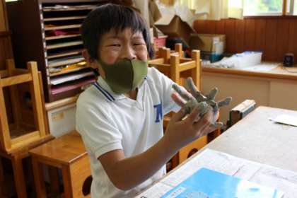 どろだんごを作っています。まずはまーるくするところからスタートです。はじめは手にたくさんひっついてきます。