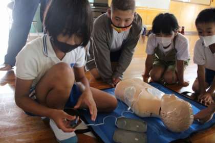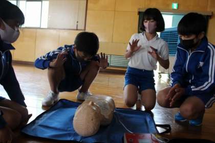 消防署の方に来ていただき、死線期呼吸、胸骨圧迫、AEDについて学びました。みんな真剣に取り組み、上手に胸骨圧迫を行うことができました◎