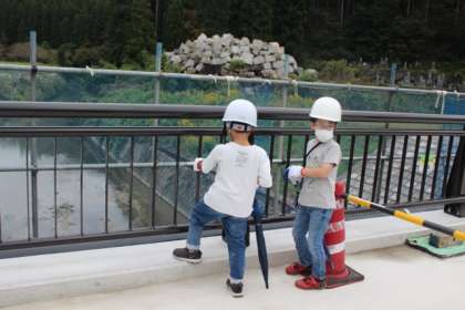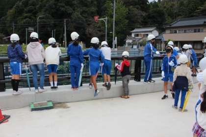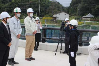 橋名のお披露目会があった後、橋の見学に行きました。工事が着々と進み、橋らしい形になっています。完成後、車が通るところを歩いて見学することができました。