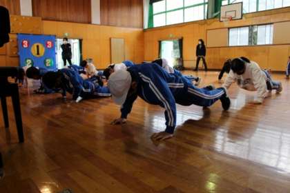 体力づくり初日はあいにくの雨だったため、集会室で筋トレやストレッチを行いました。