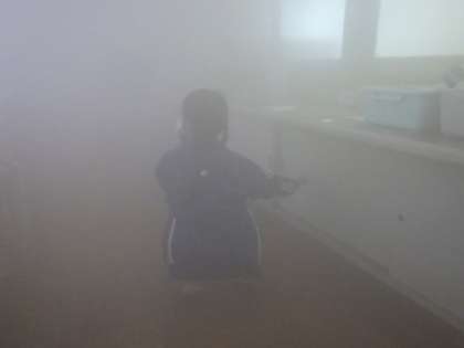 火災を想定して避難訓練と煙道体験を行いました。口元をハンカチで押さえたり、走らず安全に避難したりすることができました。