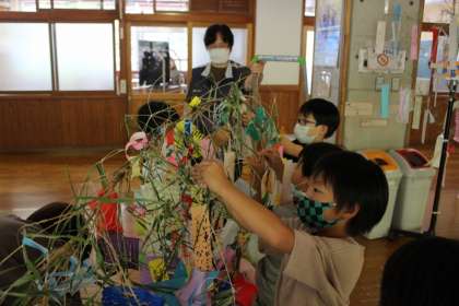 0707 ひまわり・1・2年生 七夕会 公開日 2022/07/07 更新日 2022/07/07 お知らせ 7月7日「七夕の節句」の日にちなんで、七夕会をしました。短冊に願いを書いて笹の葉に飾りました。なぜ笹の葉に飾るのかについては紙芝居で学びましたね。