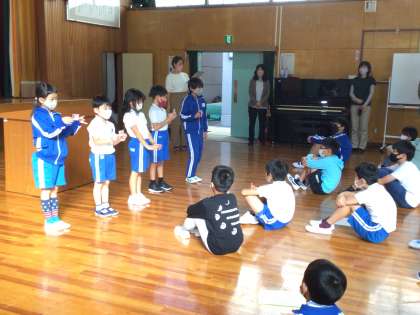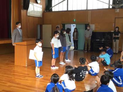 後期が始まりました。後期に向けて頑張りたいことを代表者4名がスピーチしました。さらに、夏休みの作品の表彰と、50冊以上本を借りた子へ新しいカードが渡されました。