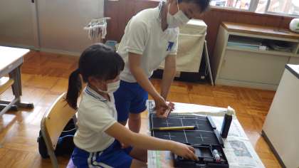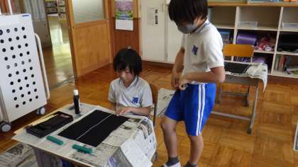 3年生は初めての毛筆でした。4年生が使い方を教えてくれました。
