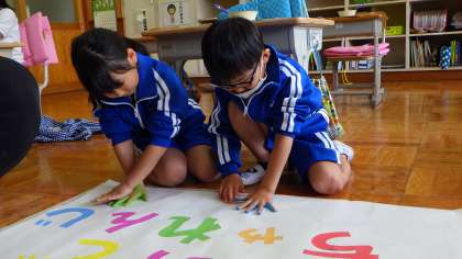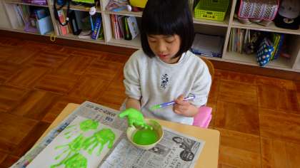 自分で絵の具を手に塗り、手形を付けました。カラフルな級訓ができあがりましたね!
