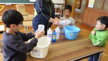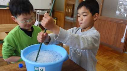 ひまわり学級主催のしゃぼん玉大会が来週開催されます。今日は、当日に向けて、しゃぼん玉液を作りました。