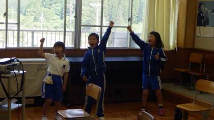 運動会で歌う赤白応援歌の練習をしました。「ゴーゴーゴー」のところでは、力強く拳を挙げます。