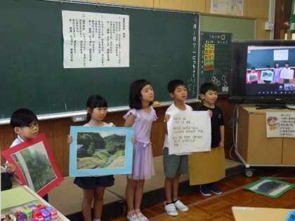 0706 1・2年生 あすけ集合学習(オンライン) 公開日 2023/07/06 更新日 2023/07/06 学校の特色ある活動 生活科「校歌じまんをしよう」 5校で校歌を発表し合いました。御蔵小は、校歌に出てくる場所を写真を使って説明しました。
