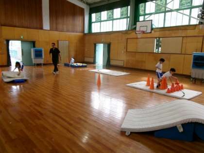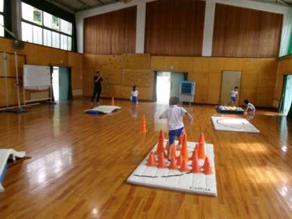 マットに様々な障害物を置いて、その障害物に触れたり、倒したりしないように進みました。