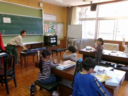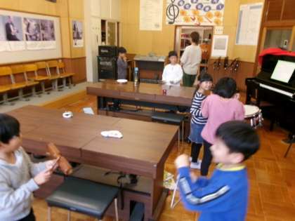 1102 1・2年生 あさがお学級 音楽 公開日 2023/11/02 更新日 2023/11/02 各学年から 曲を聴いて、どんな打楽器で演奏されていたか考え、発表しました。その後、実際に打楽器を使ってみました。