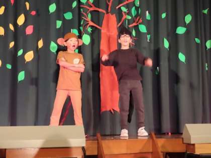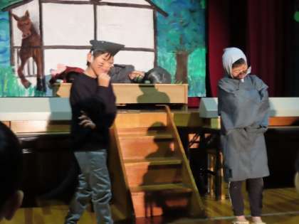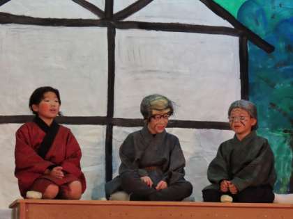 3・4年生の劇は「ふるやのもり」。子どもたちの演技に場内大笑いでした。