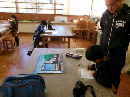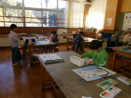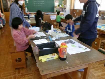 1114 1・2年生 ひまわり学級 図工 公開日 2023/11/14 更新日 2023/11/14 各学年から 読書感想画を描きました。お話から想像を広げて、児童一人一人の思いのこもった作品になりそうです。