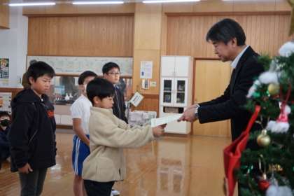マラソン大会の表彰を行いました。各学年1位、2位に賞状を渡しました。