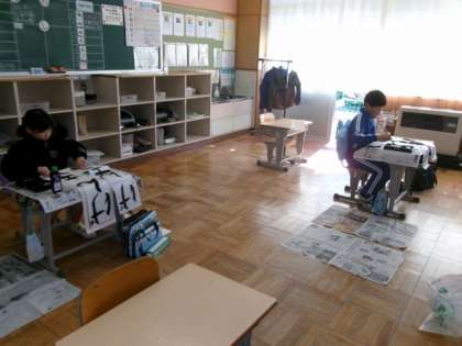 登校初日、書き初め大会が行われました。冬休み前から、練習してきた書き初めです。手本を見ながら、丁寧に書いていました。