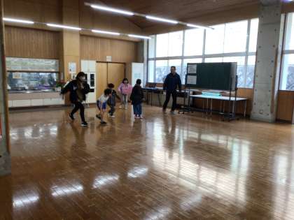 英語で言われたお題のジェスチャーをして、だるまさんが転んだのようなルールで遊んでいきます。