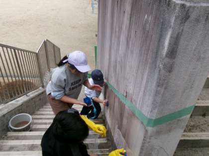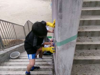 外の階段の掃除をしました。ブラシやたわしで汚れを一生懸命取り除きました。