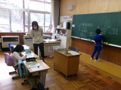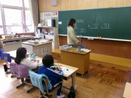 かけ算の筆算のやり方の学習でした。黒板に書いてある問題に、一人一人取り組みました。
