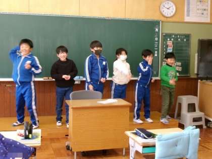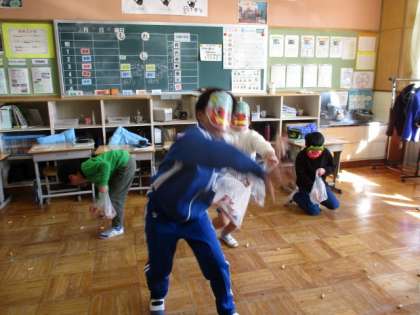 明日は節分。中学年は、豆まきをしました。福が来てくれるように、豆をまいてくれました。