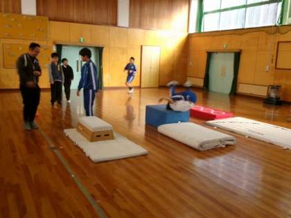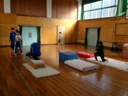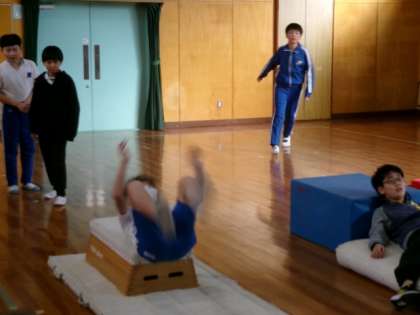 台上前転の練習を行いました。練習の場を工夫し、自分に合った練習方法で取り組みました。