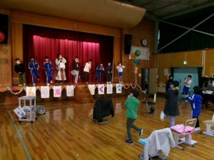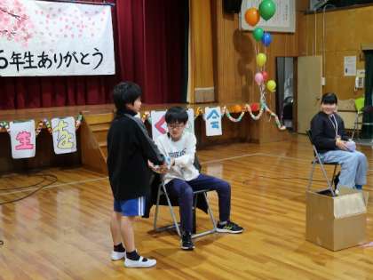 0305 6年生を送る会2 公開日 2024/03/05 更新日 2024/03/05 学校の特色ある活動 6年生を送る会を行いました。卒業を間近にひかえた6年生のために、全校で様々な企画を考えました。楽しいゲーム、6年生を主役にしたダンス、懐かしの映像、プレゼント。6年生も笑顔で参加。そして、最後には涙あり。6年生にとって、そして1〜5年生にとっても思い出に残る会になりました。