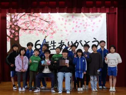 0305 6年生を送る会3 公開日 2024/03/05 更新日 2024/03/05 学校の特色ある活動 6年生を送る会を行いました。卒業を間近にひかえた6年生のために、全校で様々な企画を考えました。楽しいゲーム、6年生を主役にしたダンス、懐かしの映像、プレゼント。6年生も笑顔で参加。そして、最後には涙あり。6年生にとって、そして1〜5年生にとっても思い出に残る会になりました。