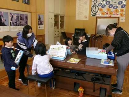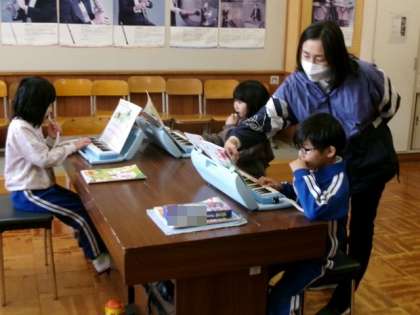 「こいぬのマーチ」を鍵盤ハーモニカで演奏しました。2年生が1年生に、演奏の仕方を教えていました。