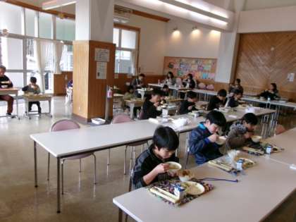 今年度、最後の給食でした。全校会食のランチルームの様子です。