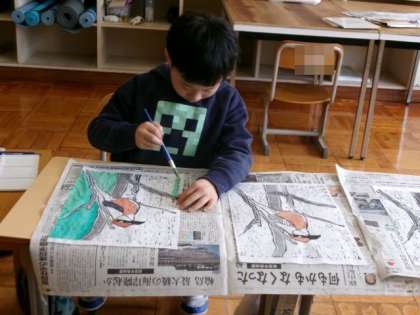 鳥(モズ)をテーマにした版画に色付けしました。どんな作品になるのか楽しみです。