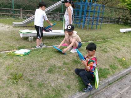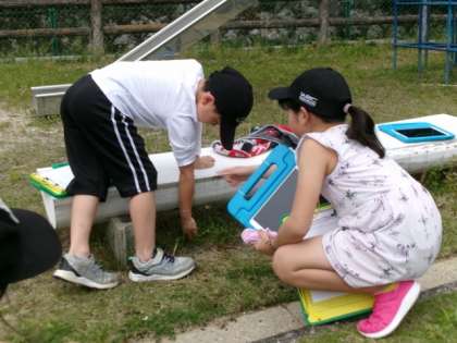 学習用タブレットを活用して、運動場で見つけた植物や虫などを撮影しました。