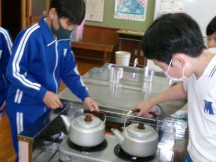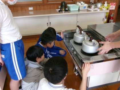 お茶の入れ方を学習しました。人数に合わせて、水の量を調節し、お湯を沸かしました。