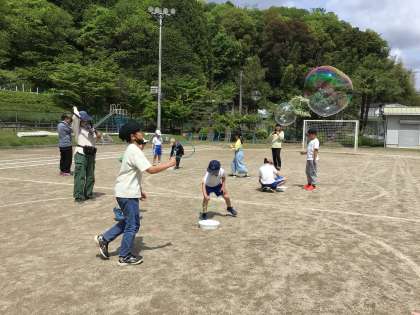 大きなしゃぼん玉を作ったり、キャッチをしたりして、全校で楽しみました。